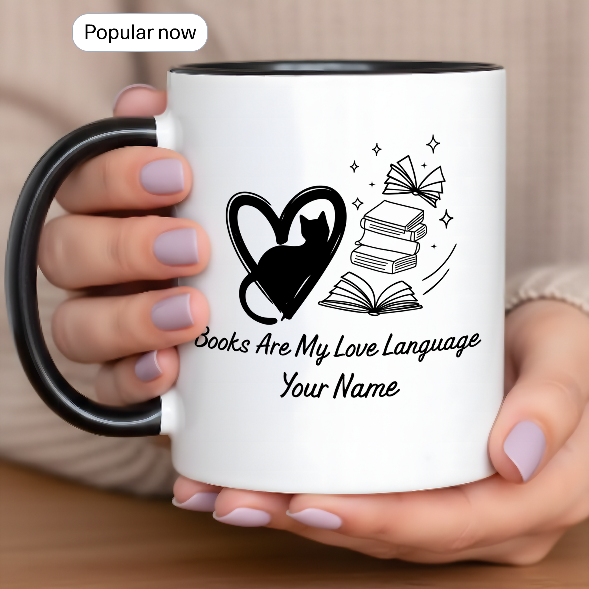 This “Books Are My Love Language” Personalized Mug is made for the reader who feels most at home between the pages of a book. Featuring a minimalist heart and open-book illustration with your custom name, this mug turns every sip into a quiet declaration of your love for literature.