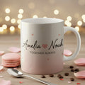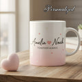 Each mug is beautifully personalized with names and adorned with soft hearts, making it a unique gift for your loved one. Whether you’re sipping your morning coffee, tea, or hot chocolate, these mugs will always remind you of the special connection you share.