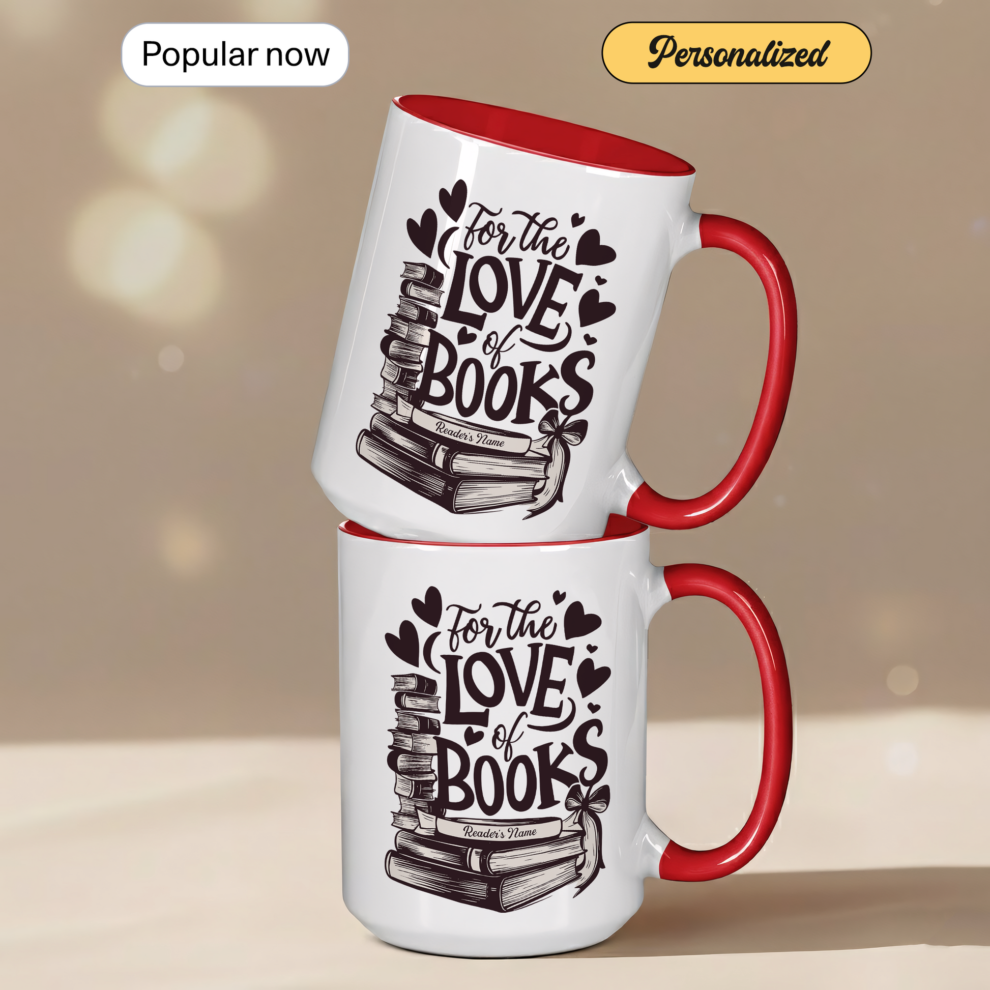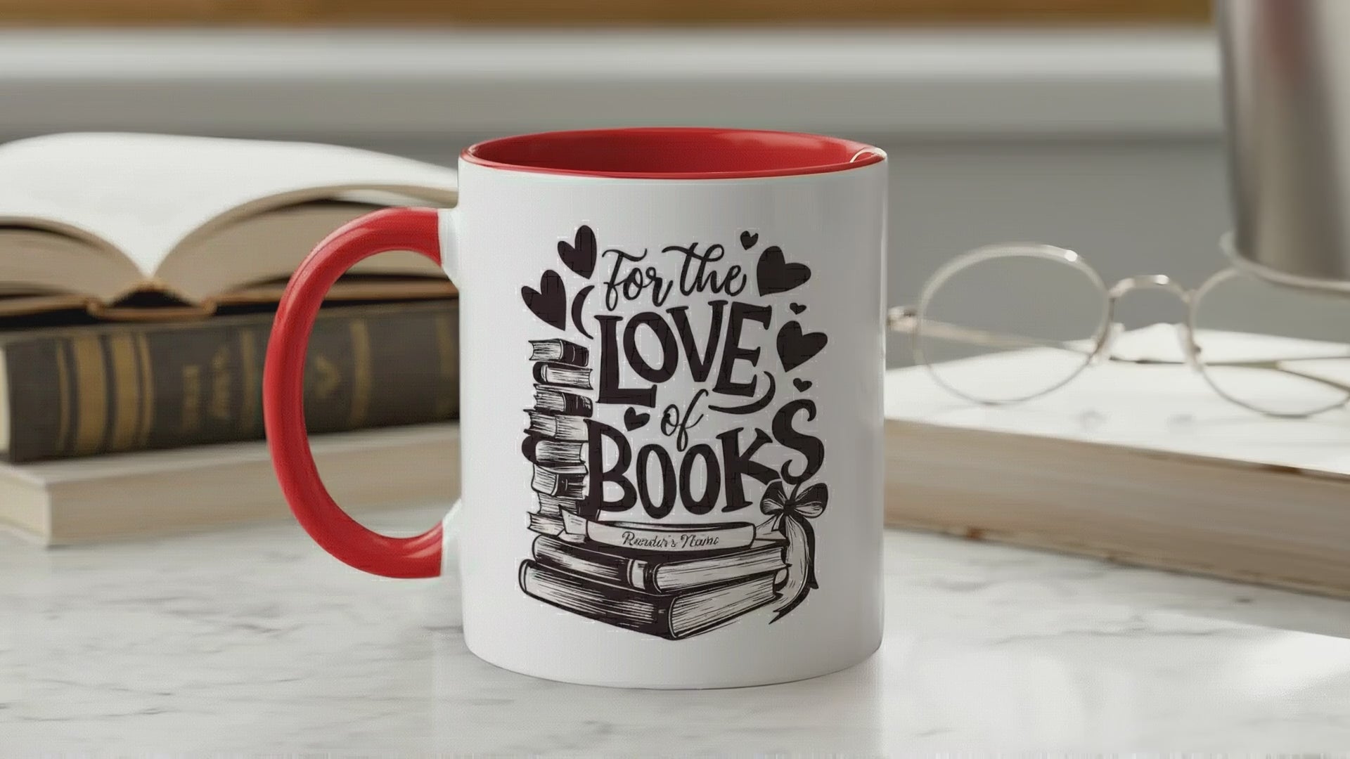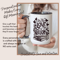 This personalized “For The Love Of Books” mug is made for those who truly treasure every page they turn. Featuring a beautifully illustrated stack of vintage books with delicate heart details, this design celebrates the deep, timeless love readers have for their favorite stories.