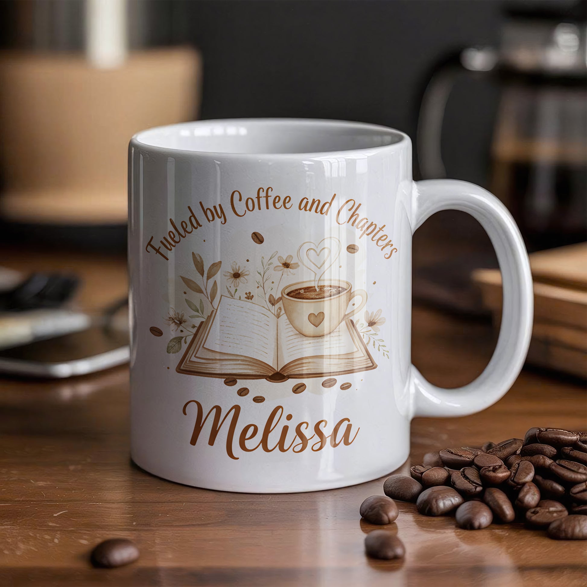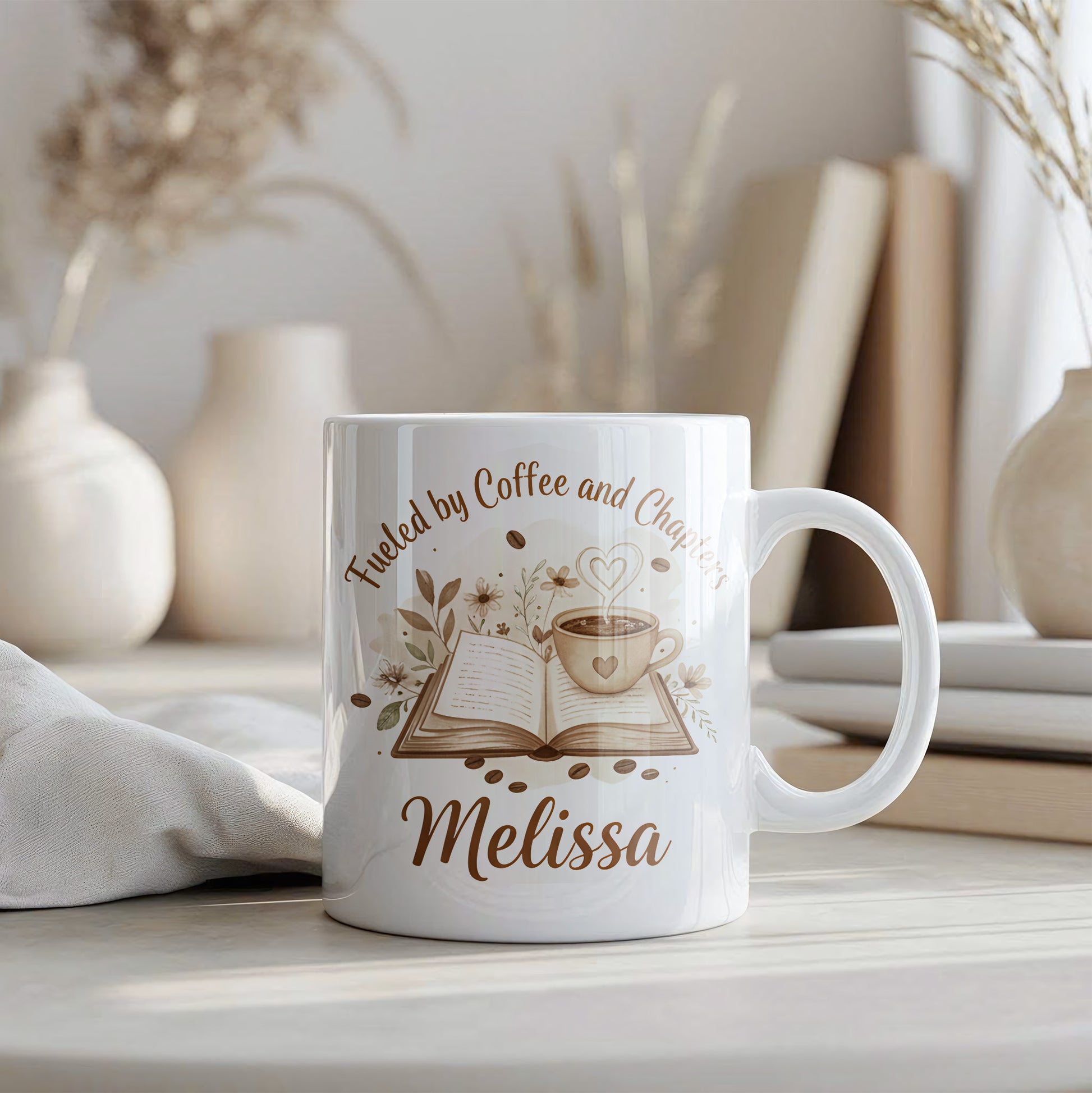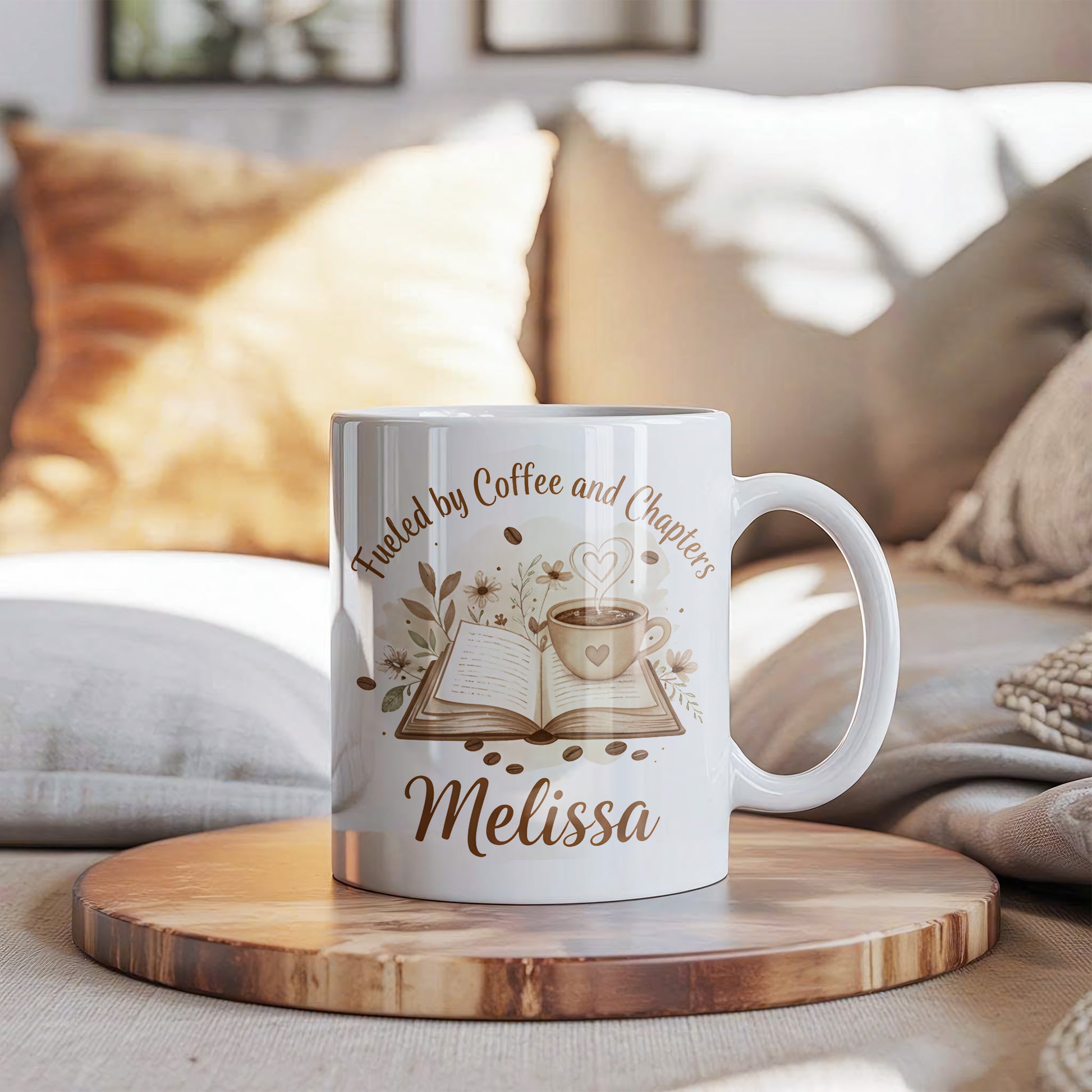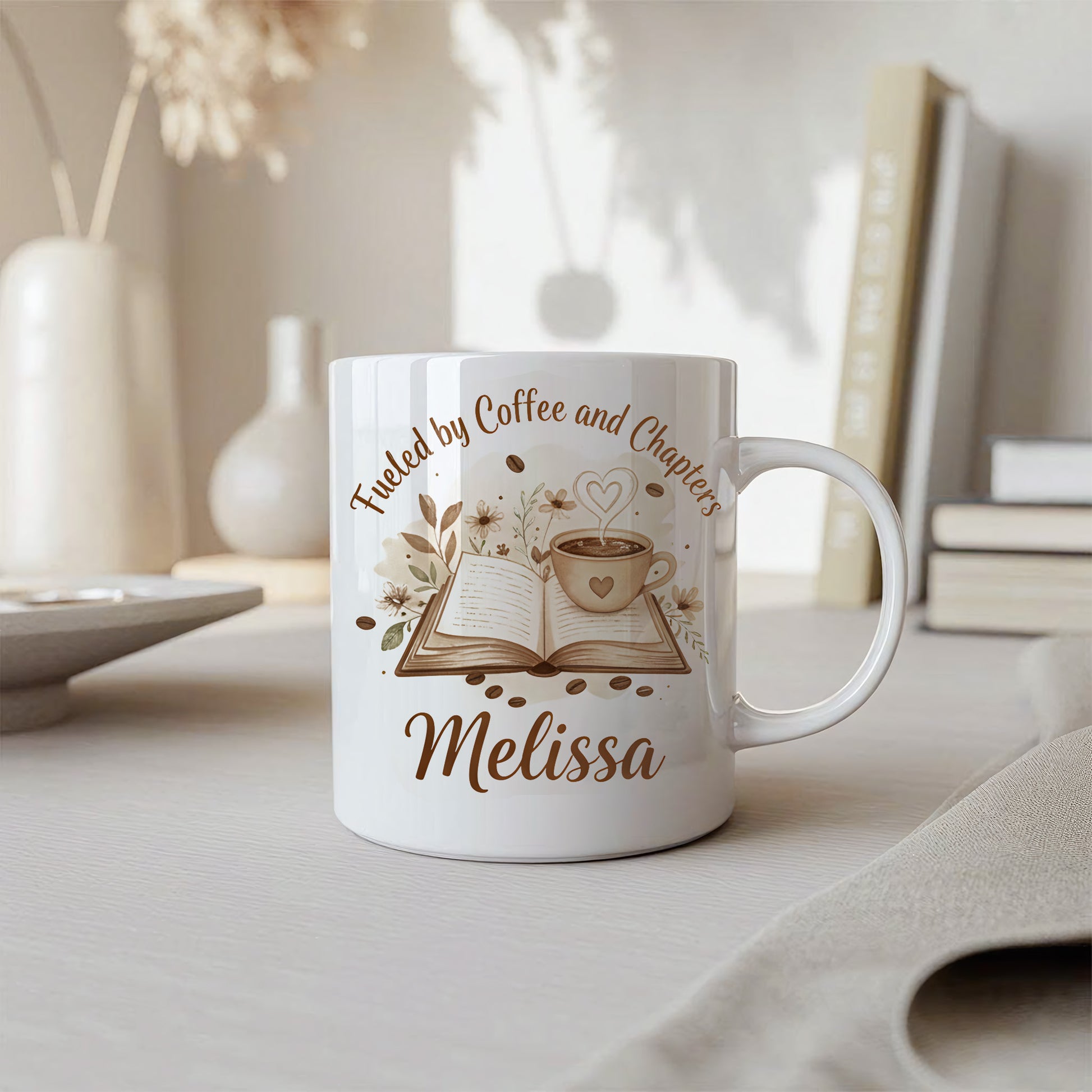 Personalize your "Fueled by Coffee and Chapters" mug today!