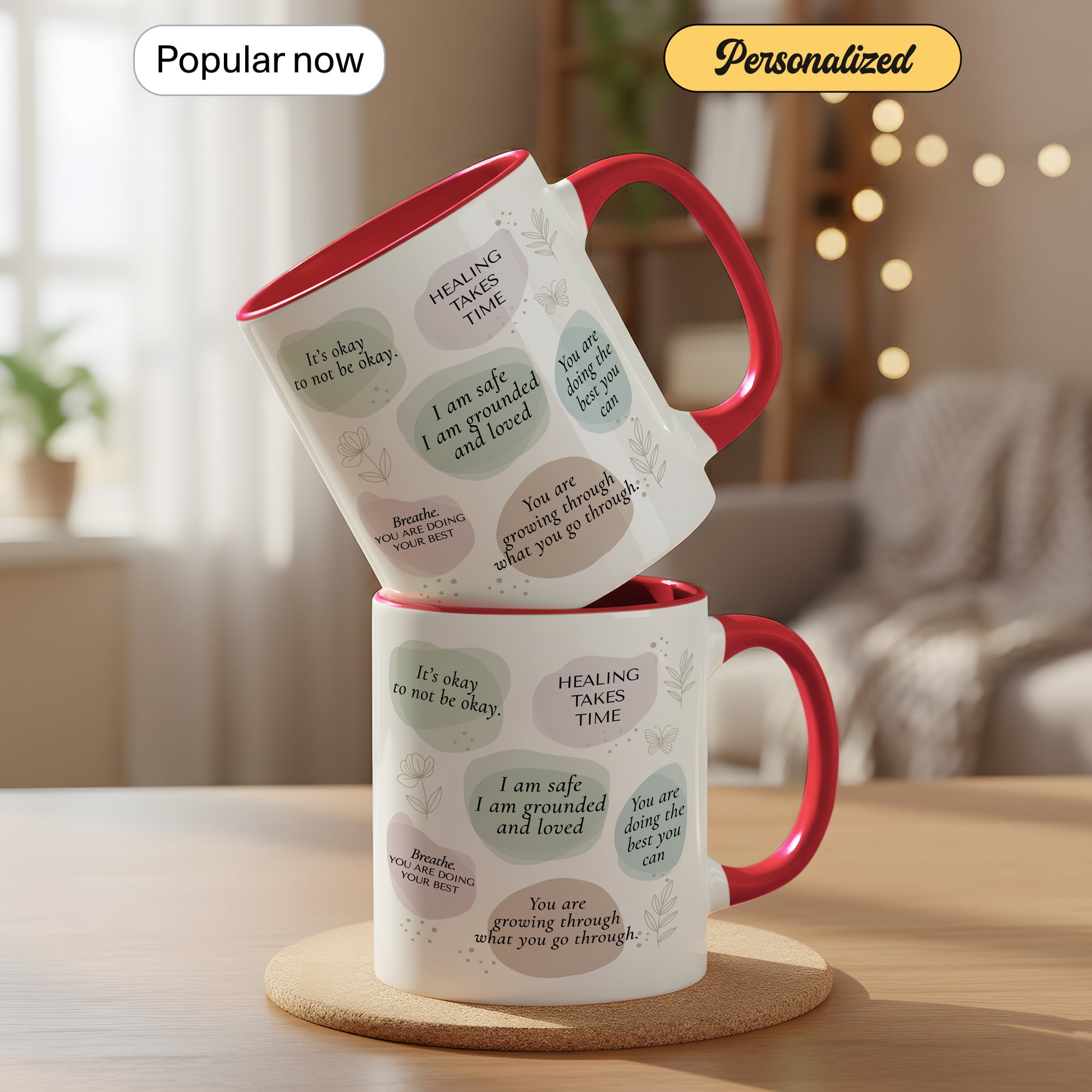 This “Healing Takes Time” affirmation mug is designed to bring comfort, calm, and reassurance with every sip. Featuring soft pastel shapes and uplifting messages like “It’s okay to not be okay,” “I am safe, I am grounded and loved,” and “You are growing through what you go through,” this mug is a quiet daily hug in cup form.