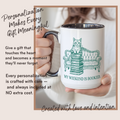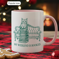 This adorable “My Weekend Is Booked” mug features a charming cat sitting on a cozy couch stacked with books — the ultimate mood for every book lover who prefers stories over social plans.