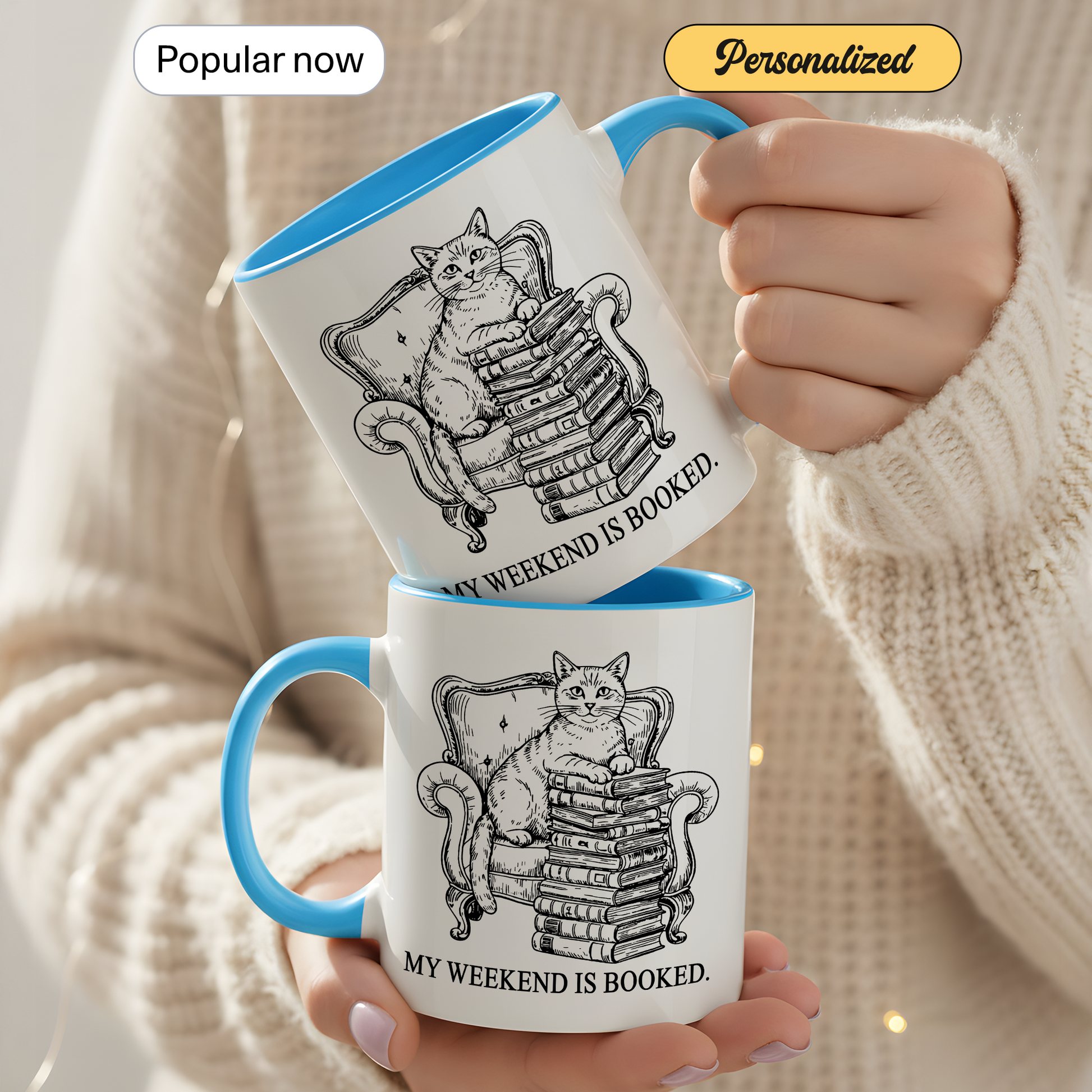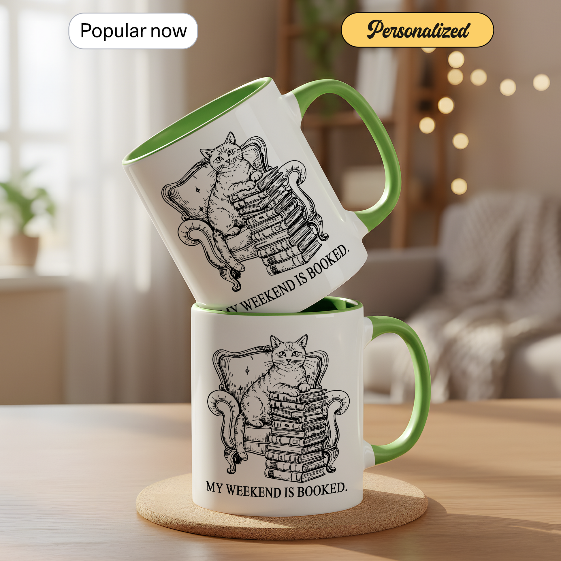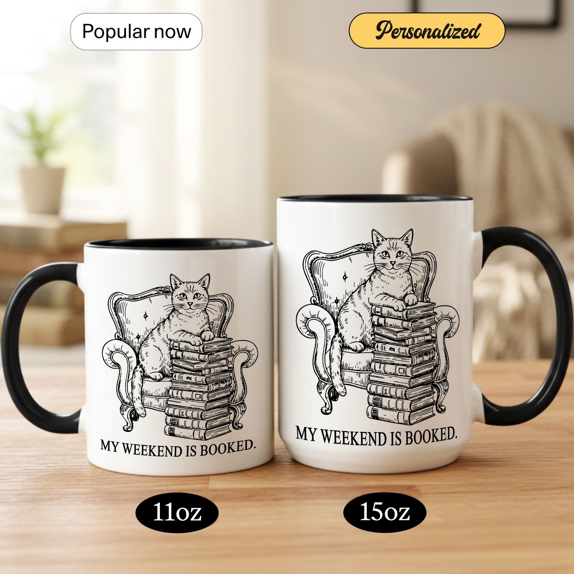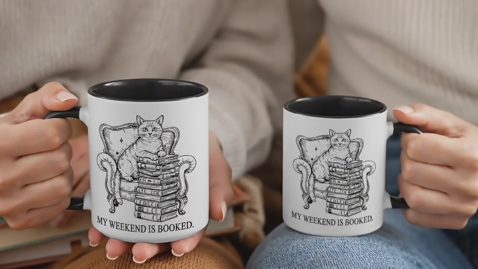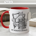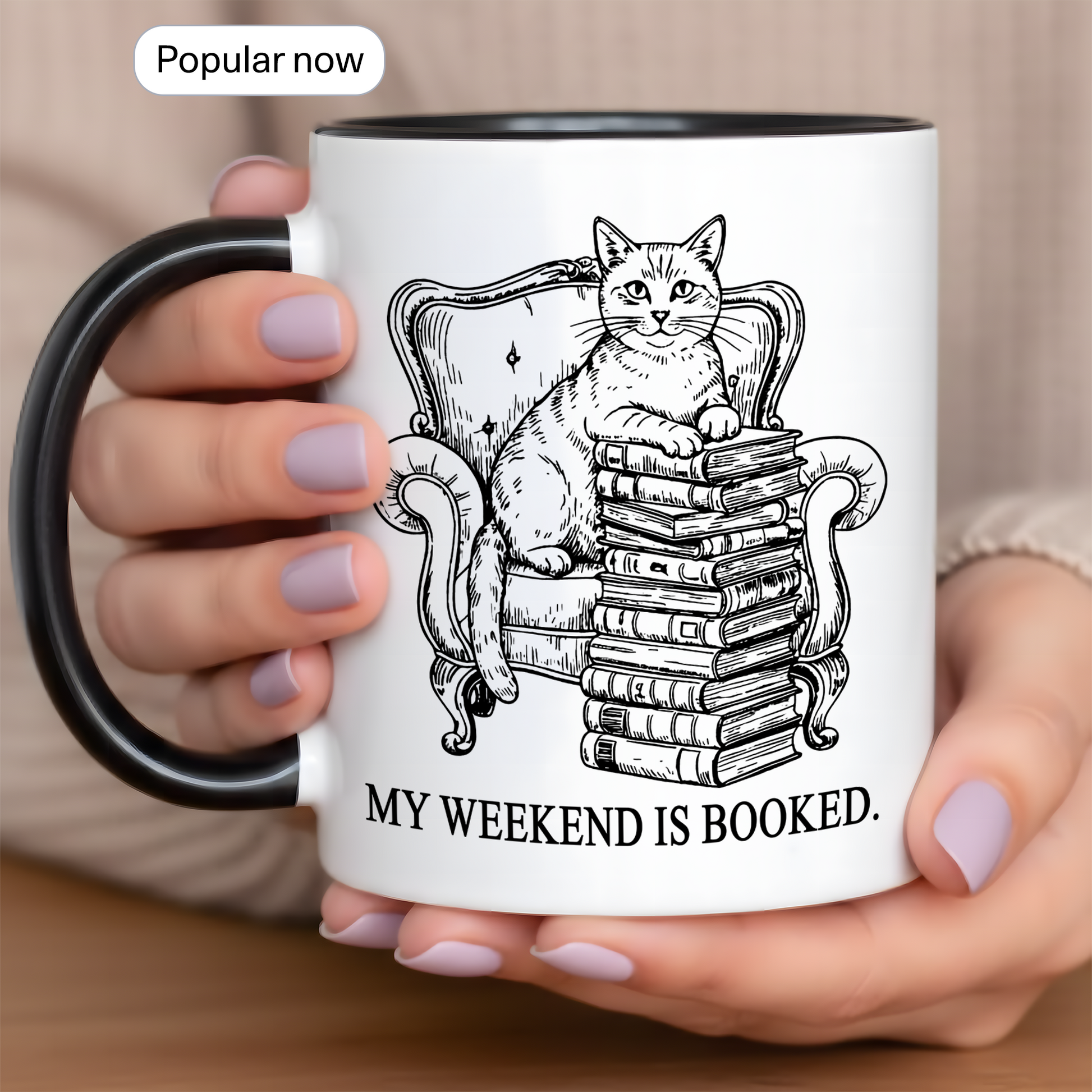 This “My Weekend Is Booked” mug features a charming vintage-style illustration of a cat perched on a stack of books in a classic armchair — the perfect symbol of cozy weekends and unapologetic introvert energy.