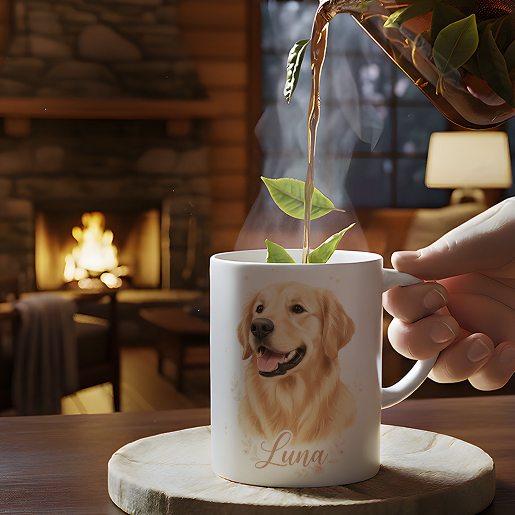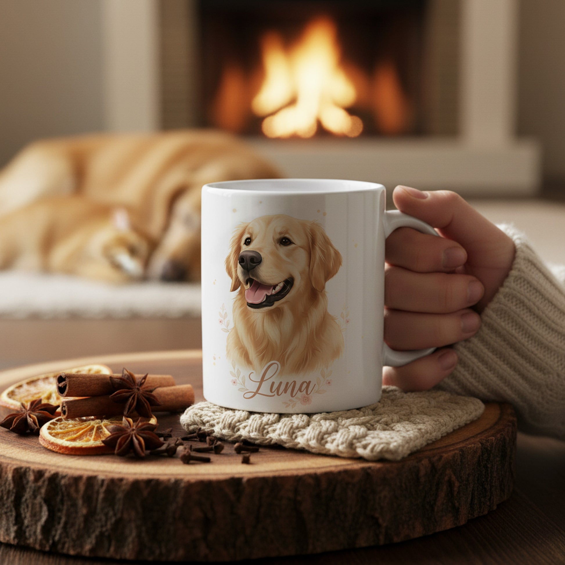 Featuring a beautifully illustrated Golden Retriever portrait in soft, warm tones, with your dog’s name elegantly printed beneath, this mug turns every sip into a moment of love, warmth, and connection.