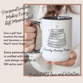 This “Cozy Reading Pages” Personalized Mug celebrates the peaceful joy of getting lost in a story. Featuring a minimalist stack-of-books line art design with elegant typography, this mug is perfect for readers who treasure their quiet reading rituals.