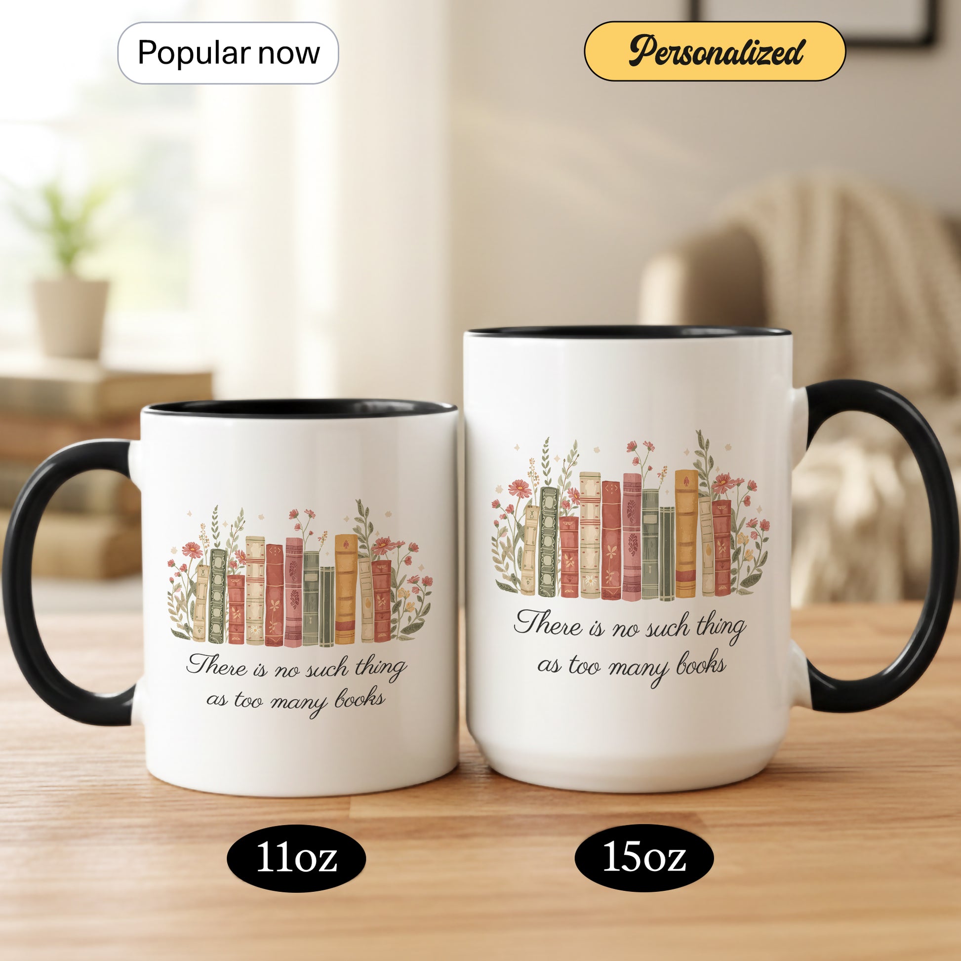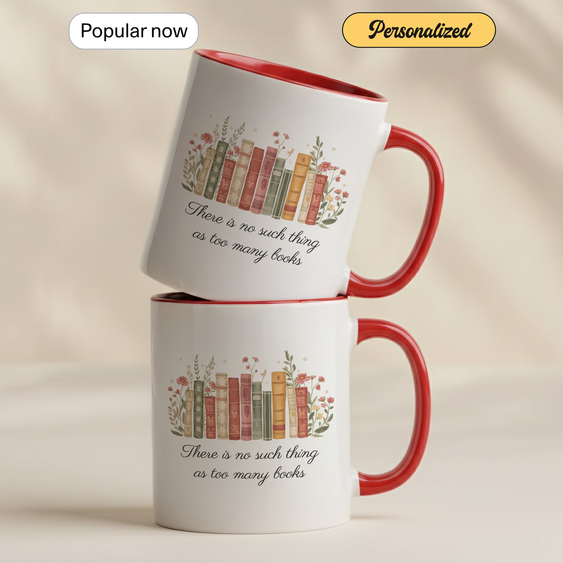 This beautifully designed mug features a charming row of vintage-style books surrounded by delicate florals, paired with the beloved quote “There is no such thing as too many books.” Soft, warm tones create a cozy, timeless aesthetic that every book lover will adore.